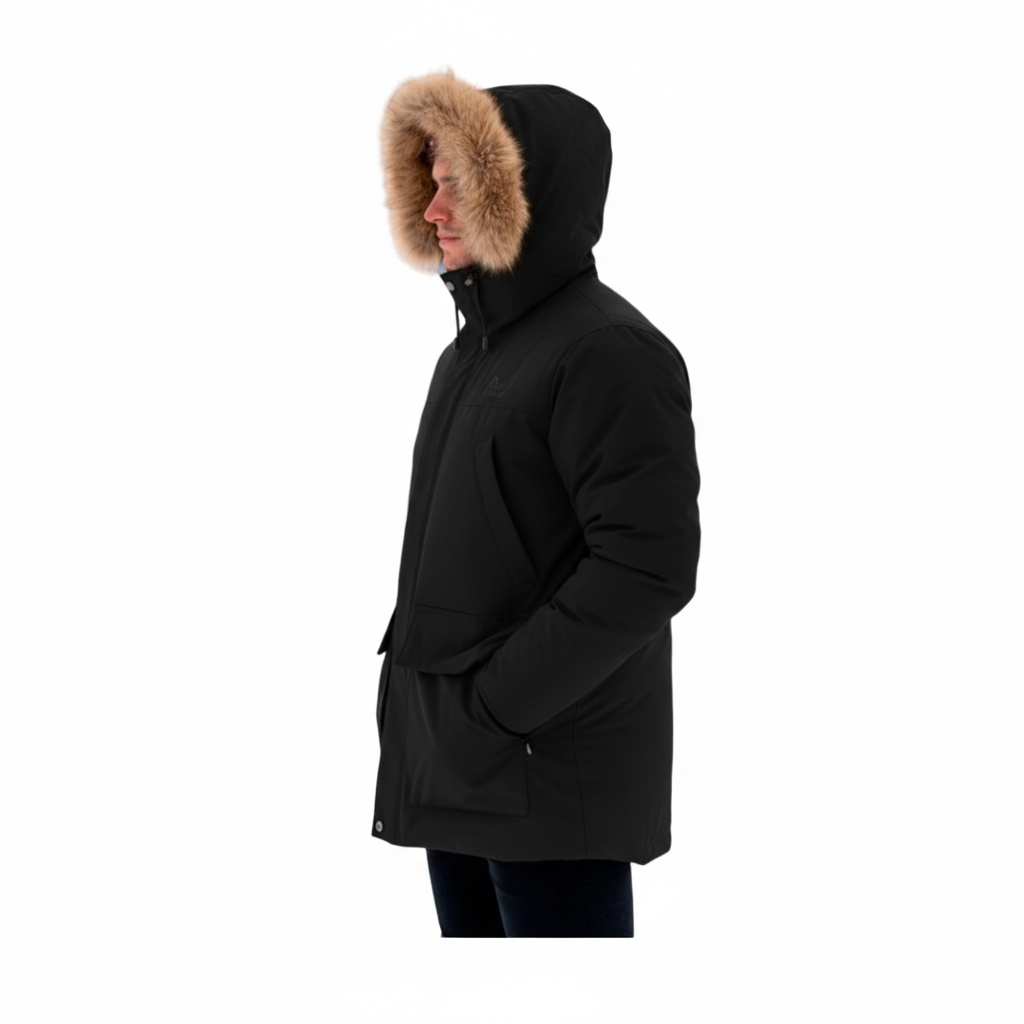 ДИКСОН – поселок городского типа, в котором находится самый северный порт России. Расположен на побережье Енисейского залива и на острове Диксон.Мужская пуховая куртка прямого свободного силуэта с внутренней регулировкой по талии, спинке и низу. Длина куртки до середины бедра. Удлиненная спинка хорошо удерживает тепло. Множество деталей дополнительного утепления создают комфортный микроклимат внутри пуховики. Анатомический крой в области плеч и рукавов позволяет свободное движение плечей и рук в стороны и вверх. Втачной капюшон-тубус регулируется по ширине и глубине, имеет отстегивающуюся опушку из меха енота. Модель предназначена для низких температур, сопровождающихся ветром и снегом.